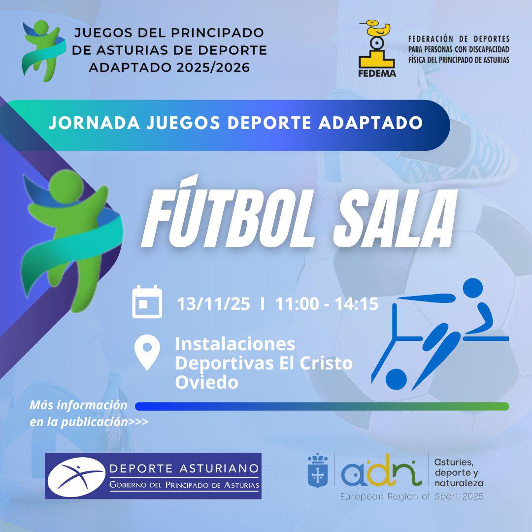El jueves 13 de Noviembre a las 11 horas se celebraran los Juegos del Principado de Asturias de Deporte Adaptado, esta vez será la Jornada de Fútbol Sala en las instalaciones deportivas El Cristo, en Oviedo.